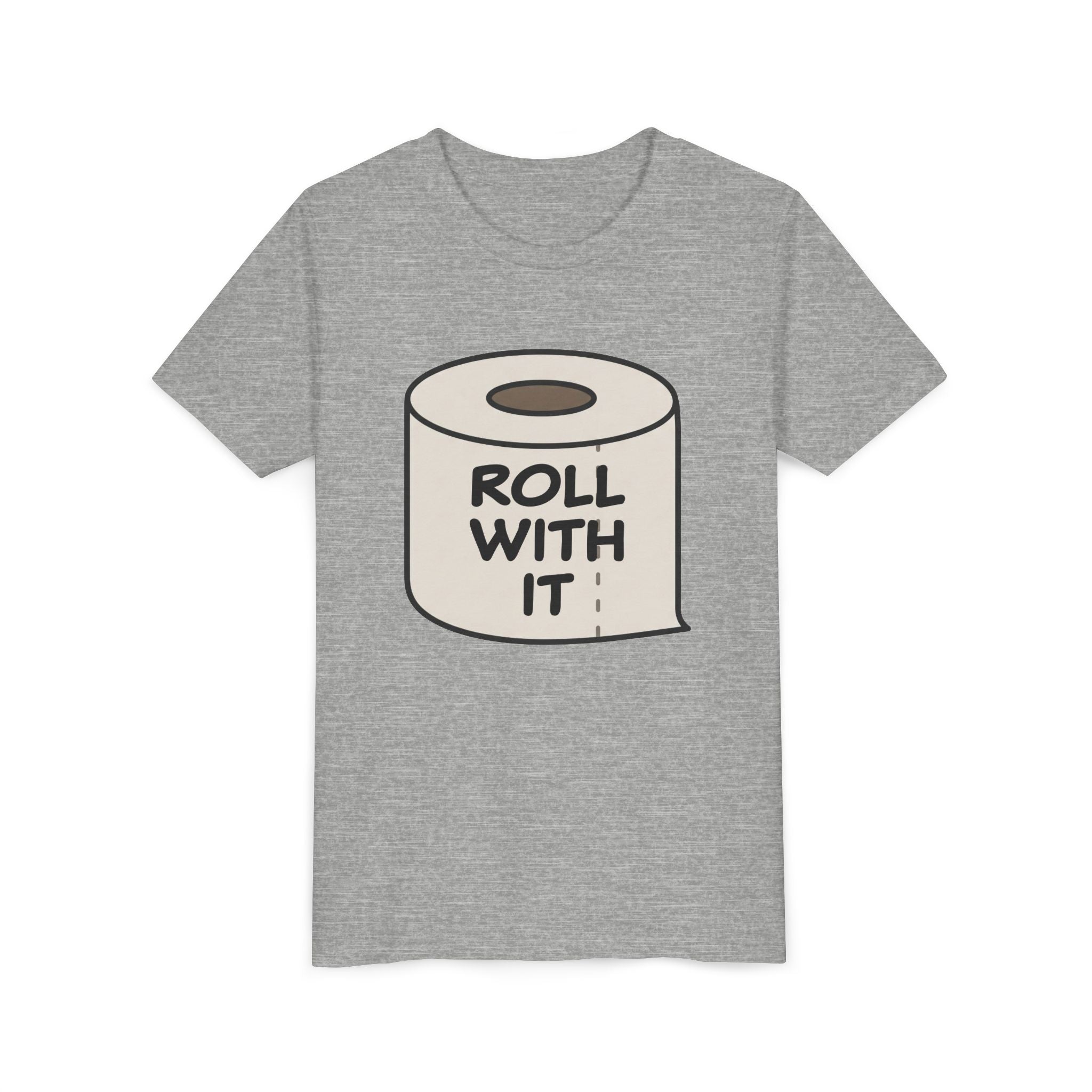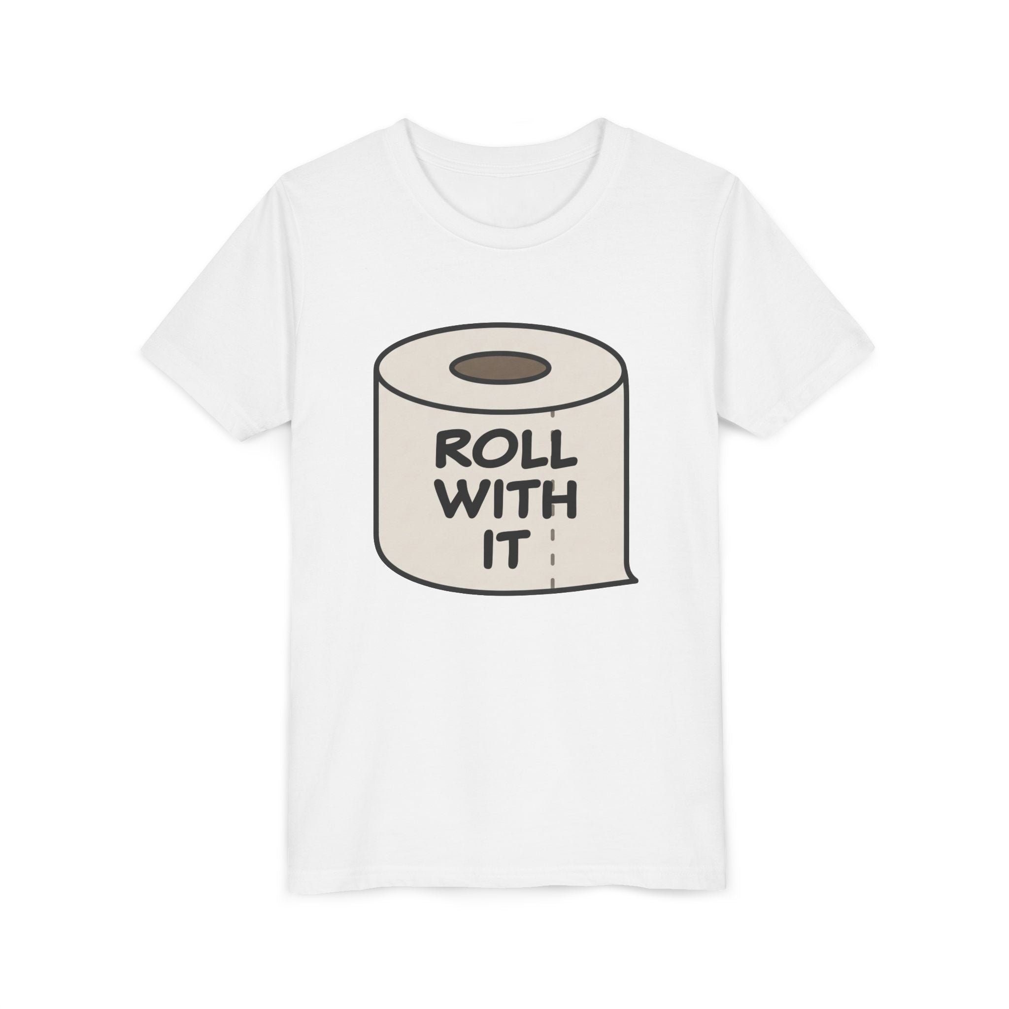 A youth short sleeve tee featuring the phrase 'Roll with it' on a roll of toilet paper. This fun and quirky tee is perfect for those with a sense of humor and can be worn casually or as a conversation starter. Ideal for those who enjoy lighthearted and playful designs, this tee is great for everyday wear, parties, and casual outings.
